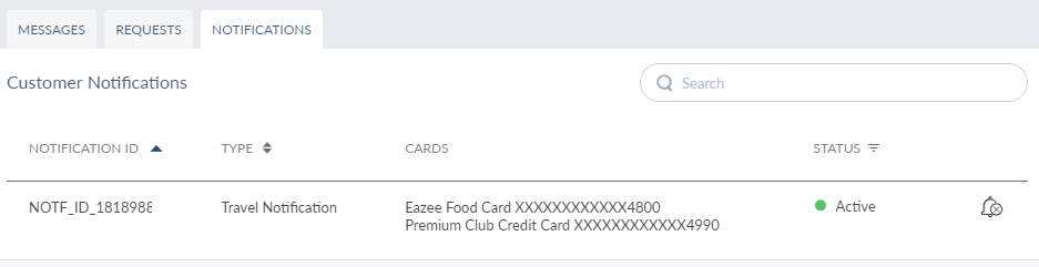 The Security page displays whether the alert preferences for a customer are enabled or disabled. If the alert preferences are enabled,  it shows the chosen channels for receiving the alerts by the customer.