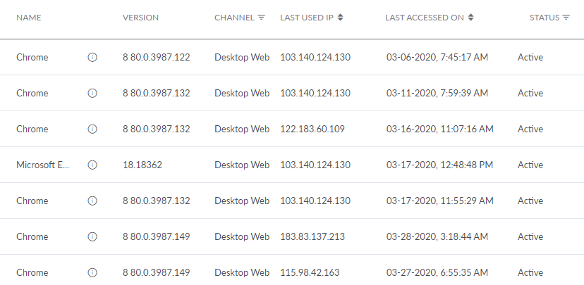 You can sort the list based on any of the columns by using the sort icon ( denotes sorted by that column) and filter the list based on the channel and status. Click the additional information icon on the required row, if you want to view the additional information about the device like registered or first accessed on date, Device ID, and OS on the device.