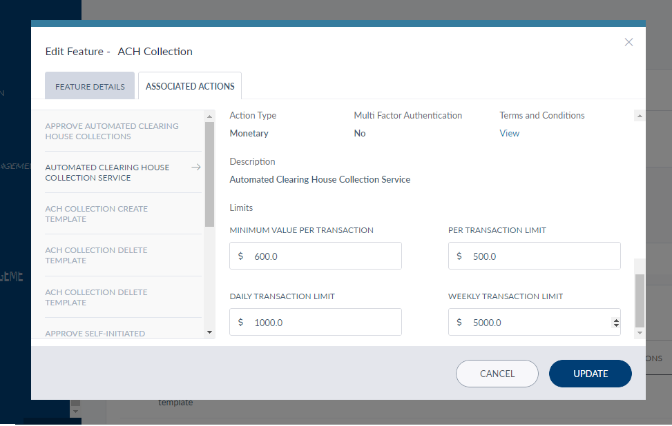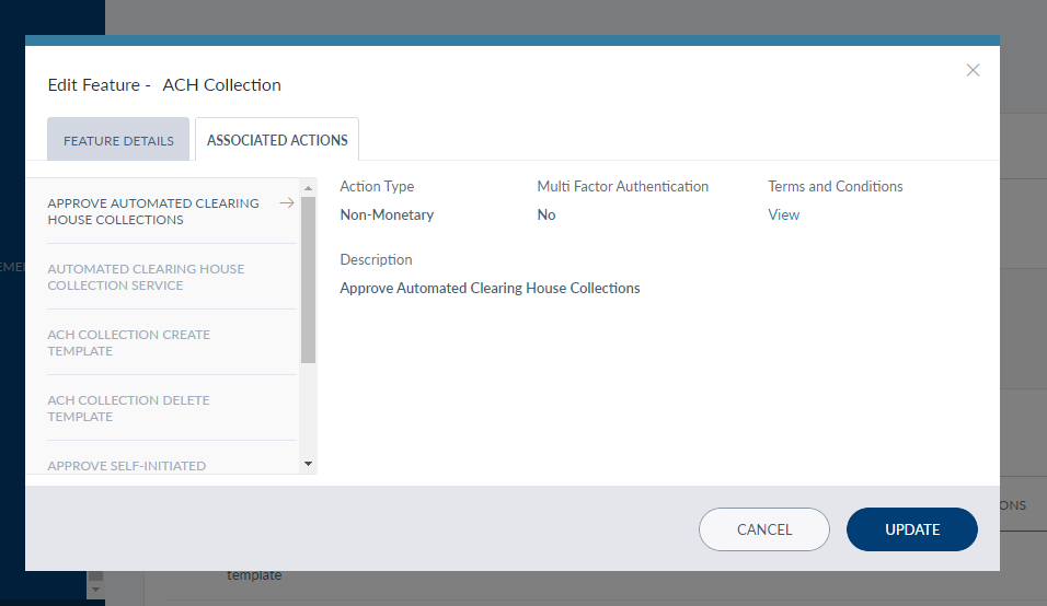 The page also contains a list of actions categorized under the selected feature. They are categorized into Monetary and Non-monetary under Action Type. The description for each action can be seen by clicking the arrow against it. The other details include whether an action requires multi factor authentication, what are the terms and conditions for it, and if limits are defined. Limits can be defined only for the Monetary actions. The user can view the T&C and limits, if defined, for an action by clicking the View button against it.