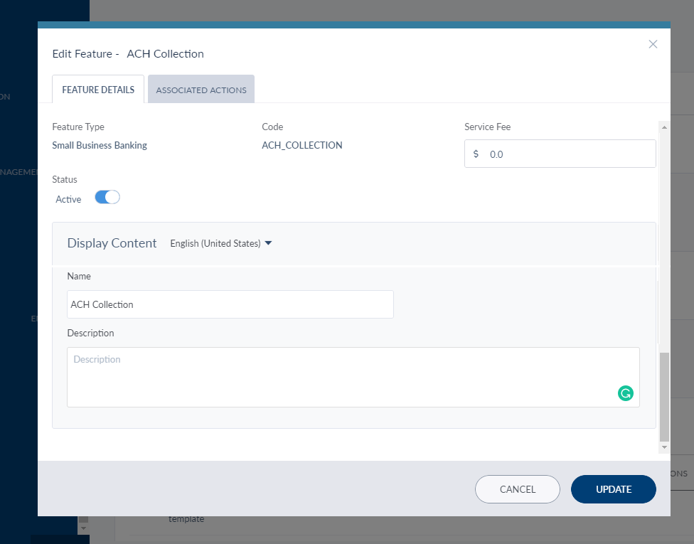 • Description: Modify the description of the feature. The maximum words allowed are 100. A description for a feature is mandatory and cannot be left empty.