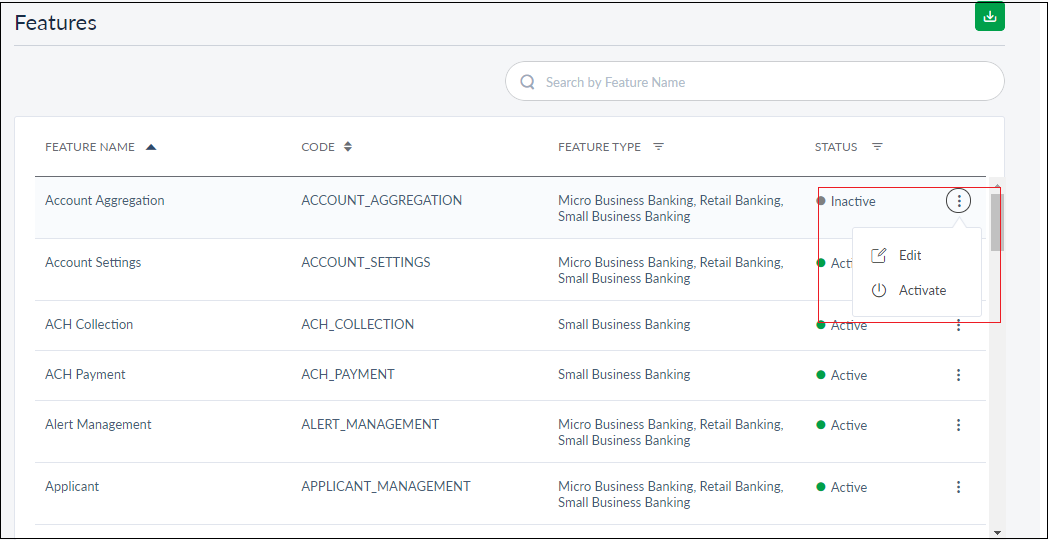 To activate or deactivate a feature, click Active/Deactivate option from the contextual menu. The feature status - Active or Deactivate - will be shown based on its current status. The user can edit a feature even if it deactivated.