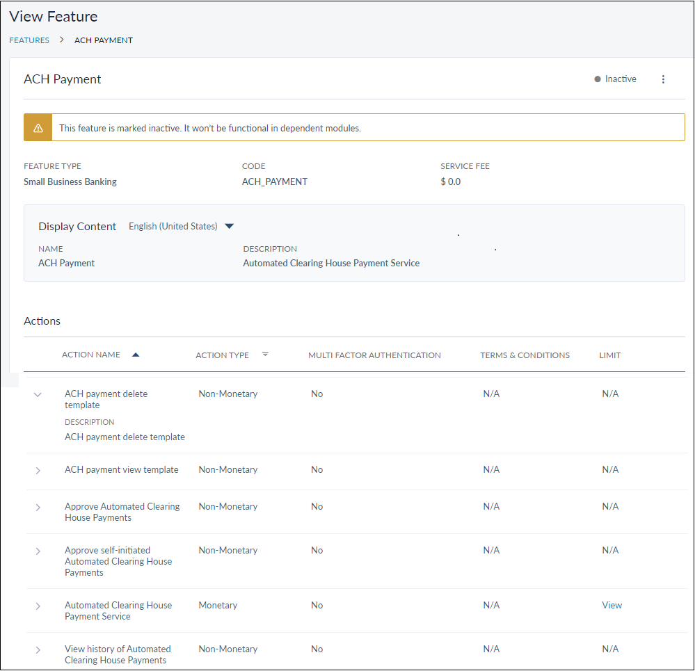 Click the required row to view the respective feature details. If a deactivated feature is selected for viewing the details, a message will be shown mentioning the same shown in the figure below.