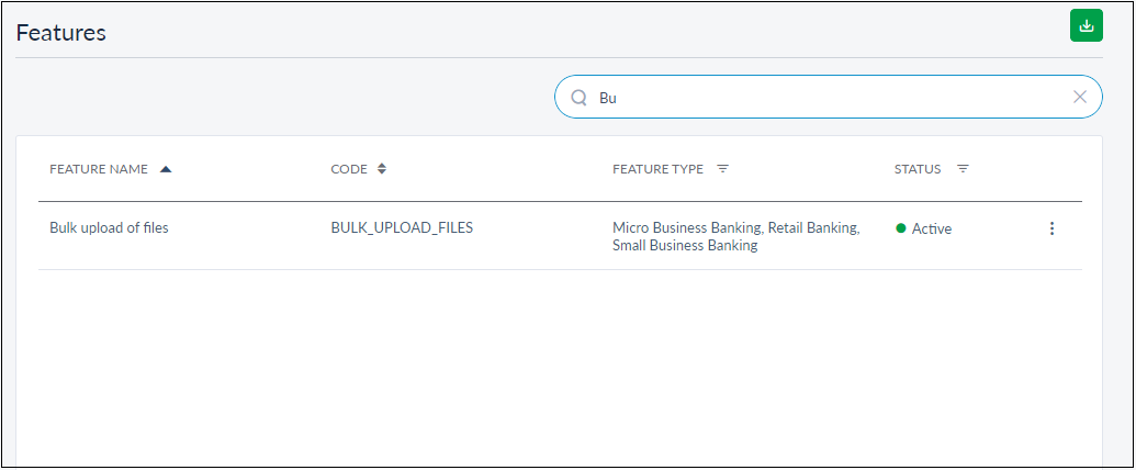 All the details listed here are fetched from the back-end system, and the CSR can view only the listed information. Sort the list based on any of the columns by using the sort icon (denotes sorted by that column). You can also filterthe list by Feature Type and Status (active or inactive). Using the download icon on the top right of the page, the CSR can download the list of features along with the details in an excel file.
