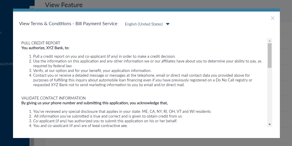 The user can edit the actions categorized under the selected feature from the Associated Actions tab. The actions mapped to the feature are listed on the extreme left of the edit pop-up window. For the Non-monetary action, the user can only view the terms and conditions by clicking the View button. The terms and conditions can be viewed in multiple languages, if defined, from the drop-down menu.