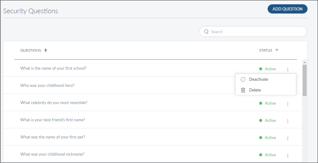 Use the feature to activate or deactivate a security question. Only those security questions with status as Active are displayed on the relevant app when users search for them.