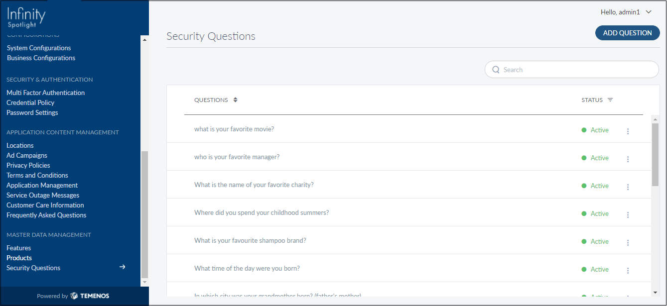 Spotlight allows the banks or credit unions to configure the master records of security questions. This is the list that will be visible to the end customer when they are registering on their apps. Once selected, these questions will be shown to the user as a MFA tool. At any time, there should be 10 questions for the user to choose from.
