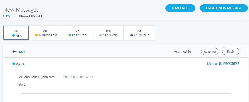 The messages list in New, In Progress, Resolved, and Archived tabs are represented as rows with the following details: Request ID, Customer Name, Subject, Category, Date and Assigned To. The rows in the message list in My Queue tab are similar to other tabs except for the Status details instead of Assign To details.