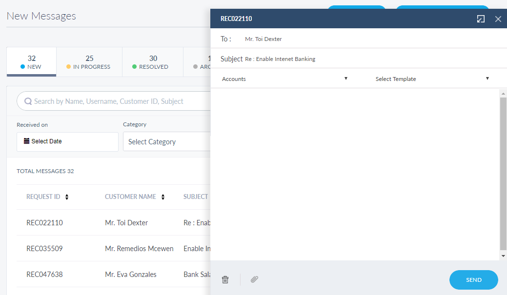 Customer care employees can view all messages sent by the end-user using the secure messaging feature of the mobile or online banking application and respond to these messages. Threads are grouped by their status and placed in a common queue, so customer service representatives of that department can pick any of them up and provide an appropriate response.