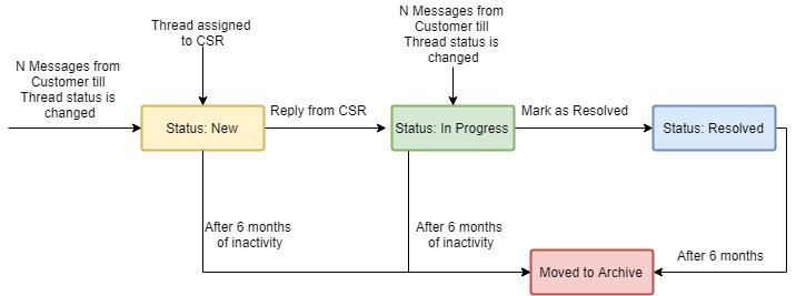 - A customer can send one or N messages in a thread. The status of the thread remains New till the CSR takes any action on it.