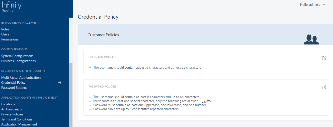 Spotlight displays the Credential Policy screen which shows the current username and password policies for the Customers.