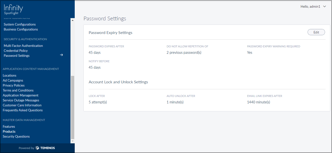 An administrator can use the feature to view and define password settings and account lock and unlock policies for customer applications.