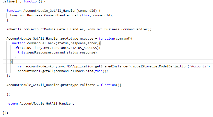 AccountModule_GetAll_Handler, this class implementation is as follows: - This is the base command handler and it will have the business logic inside the execute method. With the help of the command handler extension, you can either override the whole business logic, or you can add some logic before the execute method like a pre processor method, and you can add some logic after the execute method like post processor. This pre processor method called