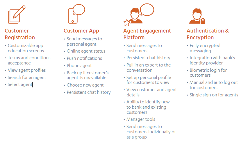 Infinity Engage is a unique mobile financial messaging tool that helps build 1:1 digital relationships between bank employees and customers using a messaging style interface that is familiar and comfortable to users. Customers access the solution via a mobile application available in the applicable app stores, while bank agents access the solution through a browser-based interface that permits messaging with multiple customers in parallel, and provides a full messaging history.