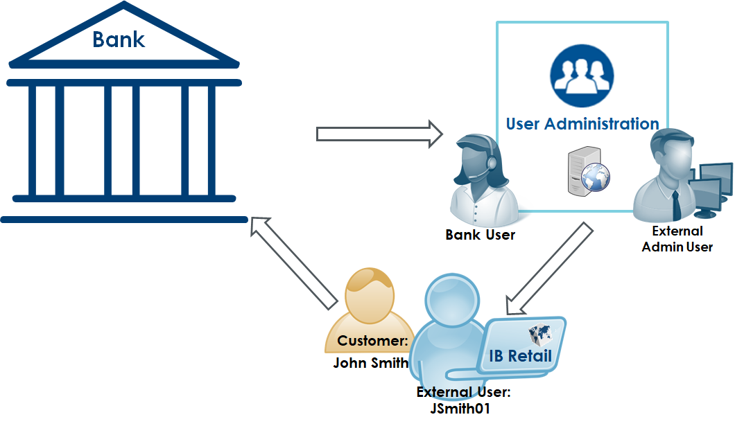 User Administration is a user-friendly WebApplication based on Temenos UXP, with IRIS as the interaction layer that processes data from Temenos Transact. This end-to-end solution supports the management of external users and arrangements. Once created, the external user provides valid login details to E-Banking Applications such as Internet and Mobile Banking Retail accessed using any Internet-connected devices (laptops, mobiles, tablets, smartwatches, etc). While User Administration is the front-end application providing the control of administrative activities, the information is still processed and held in the appropriate Temenos Transact tables.