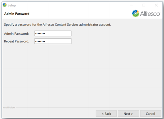 - Admin Password: Specify a password for the Alfresco administrator account..
