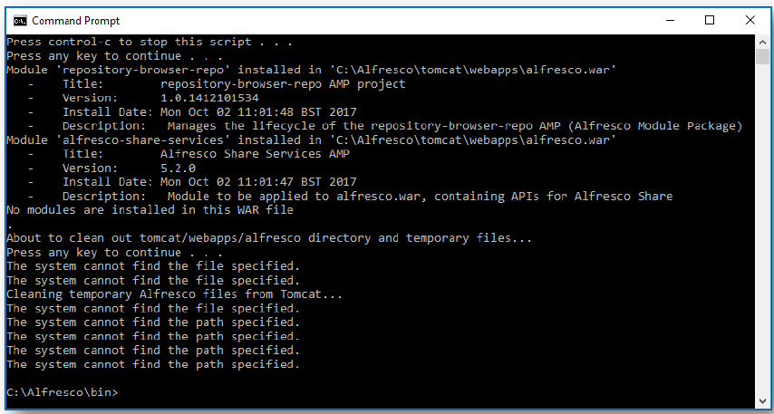 - What version do you have? The FEAtures Learning Platform currently uses Alfresco Community Installer alfresco-community-installer-201707- win-x64.exe.