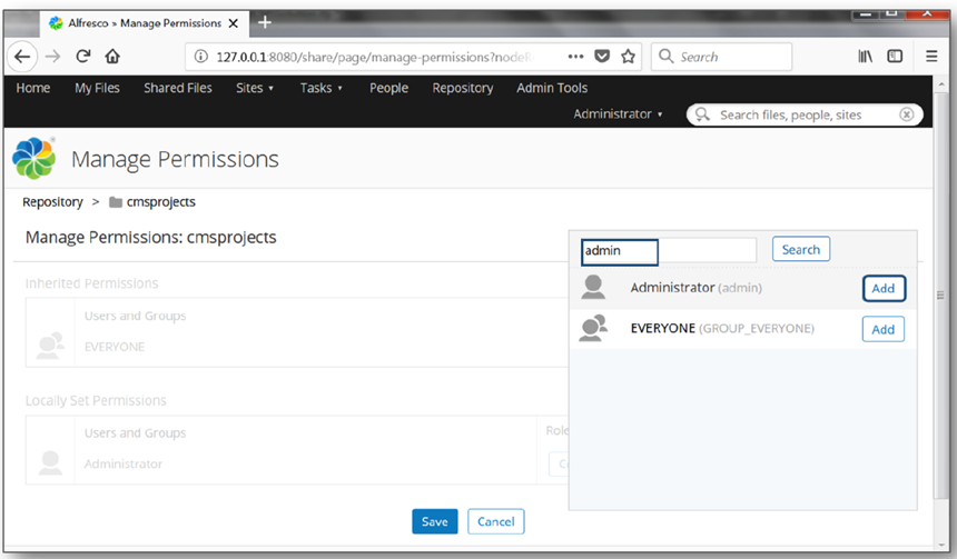 The following pages show how to set permissions for the ‘admin’ user on the folder /cmisprojects and to add a new user called ‘coordinator’. You will then be able to login to Live CMS with these user names and create and publish Live CMS articles.