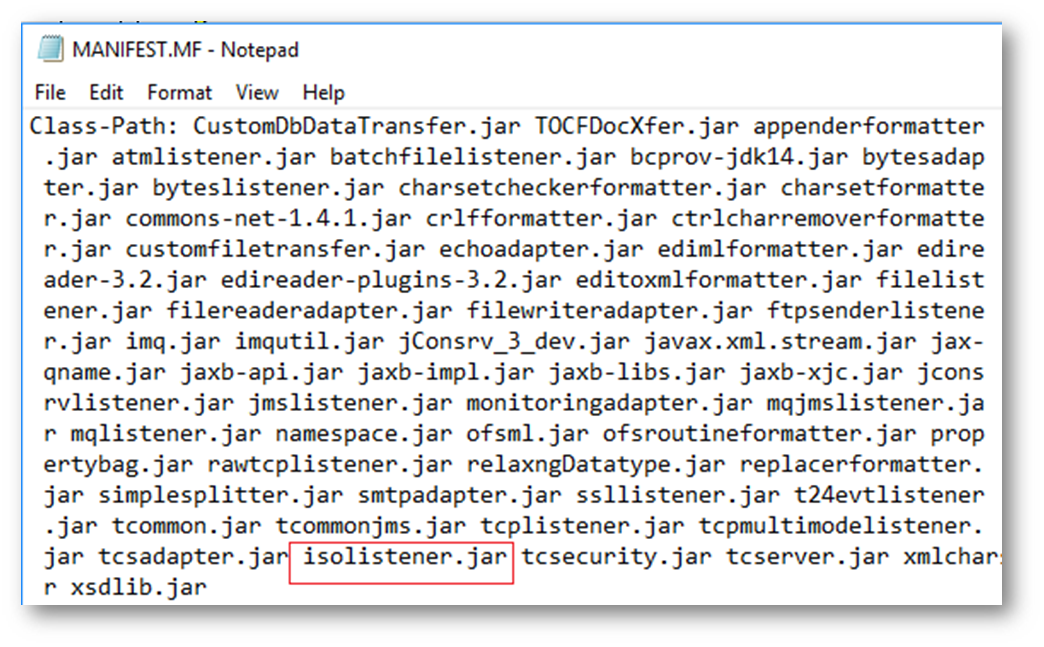 - Amend the MANIFEST.MF file under tocfee.ear>tocfplugin-ra.rar>META-INF and tocfee.ear>tocfplugin-ra.rar> tocfplugin.jar>META-INF to include the name “isolistener.jar” (without quotes).