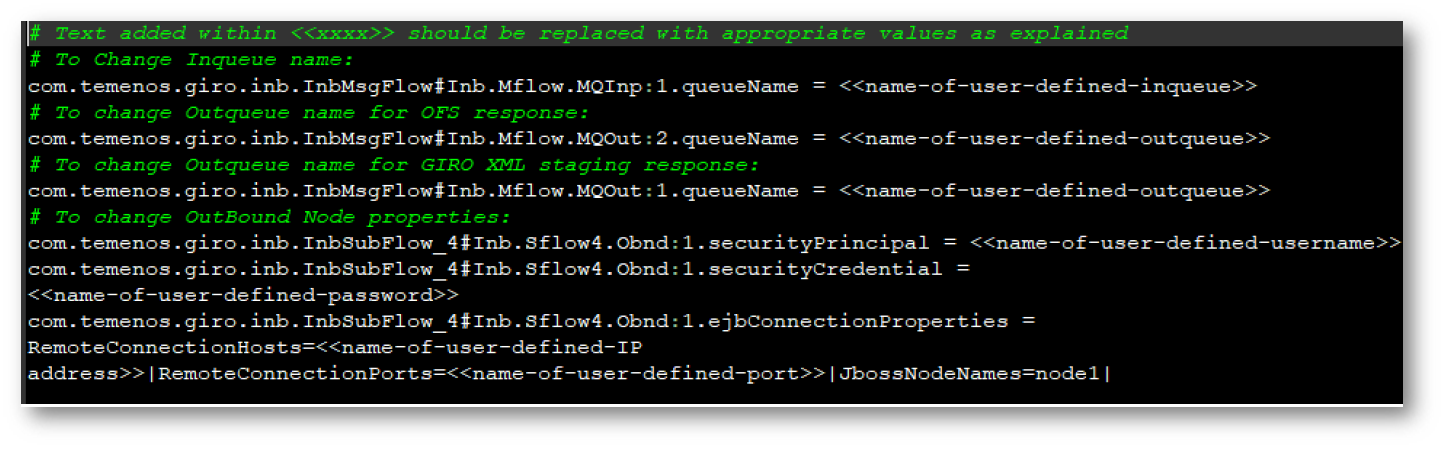 - mqsiapplybaroverride -b "<<location-of-bar-file>>" -k GIRO _Outbound -m “com.temenos.giro.outb.OutbSubFlow_1#Outb.Sflow1.MQut:1.queueName= <<name-of-user-defined-outqueue>>”