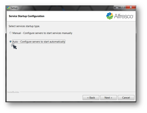 - Click on the Next button and the Service Startup Configuration screen is displayed.
