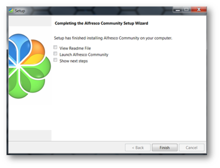 - Unmark the Launch Alfresco Community option.