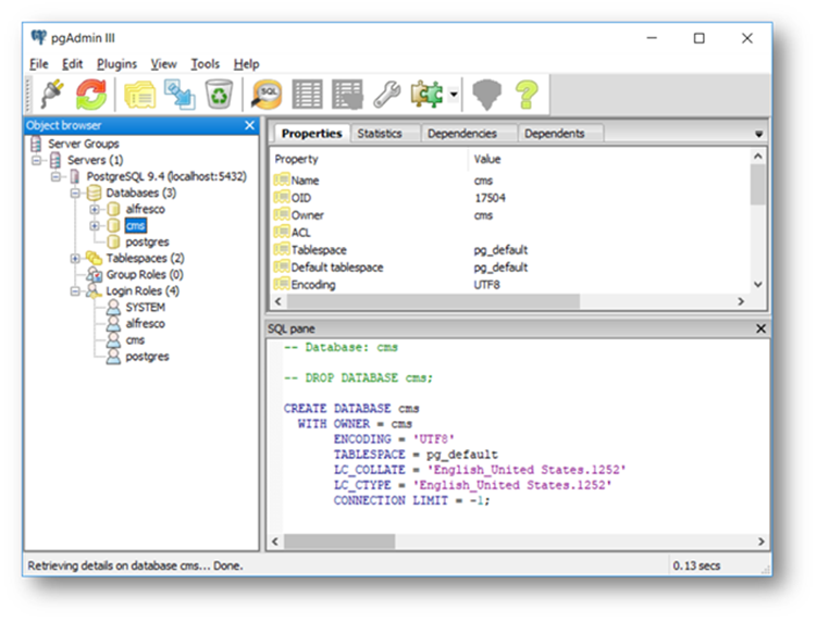 The following steps show you how to use the PostgreSQL pgAdmin III application to add a database and user that will be used by the CDA UXP project to store the content structure of the project (for example article structure, placehoders etc.). The out of the box alfresco database will be used to store the actual content (images, text, rich text).