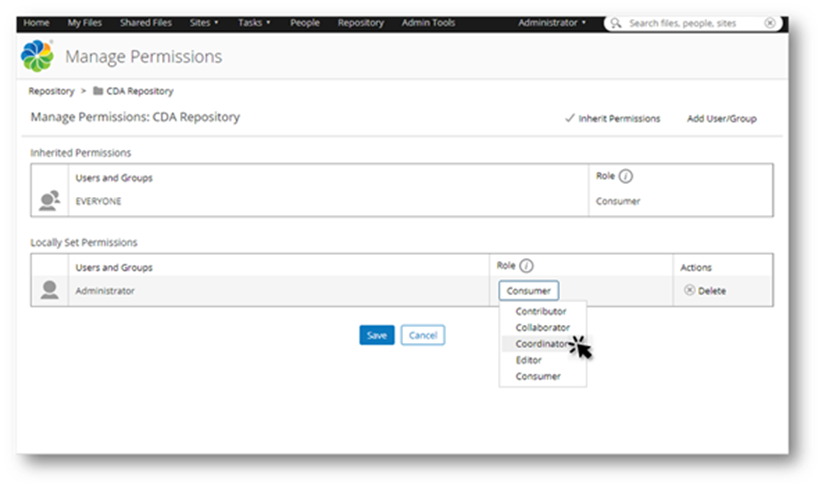 In order to use the CDA project to define new articles you will need to modify the permissions for the project folder directly on the Alfresco server to correctly setup the CMS user roles to create (contributor or collaborator) and publish (coordinator) content. In the example below there is only 1 role (admin) that has the coordinator role assigned.
