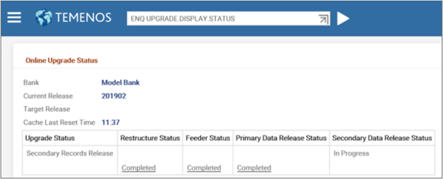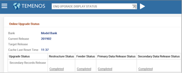 - After the release of primary data items, Primary Data Release Status changes to Completed and Upgrade Status changes to Secondary Records Release. This initiates the T24.UPGRADE service.