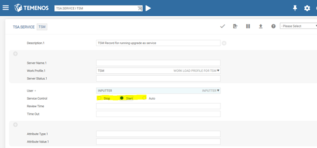 - Select Start in the Service Control field for both TSM and T24.UPGRADE.