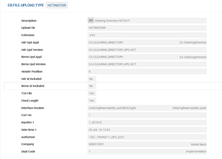 EB.FILE.UPLOAD.TYPEtable in the directory mentioned inEB.FILE.UPLOAD.PARAMtable. - To enable automatic upload of the clearing directory, create an information file (text file with any filename, for example, UKDIR.XML) in the ‘tcupload’ folder of