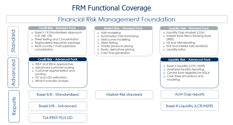 The Credit Risk module is a comprehensive Basel II and Basel III analysis and reporting tool, which calculates Risk Weighted Assets (RWA) and capital ratios through Standard Pack edition.