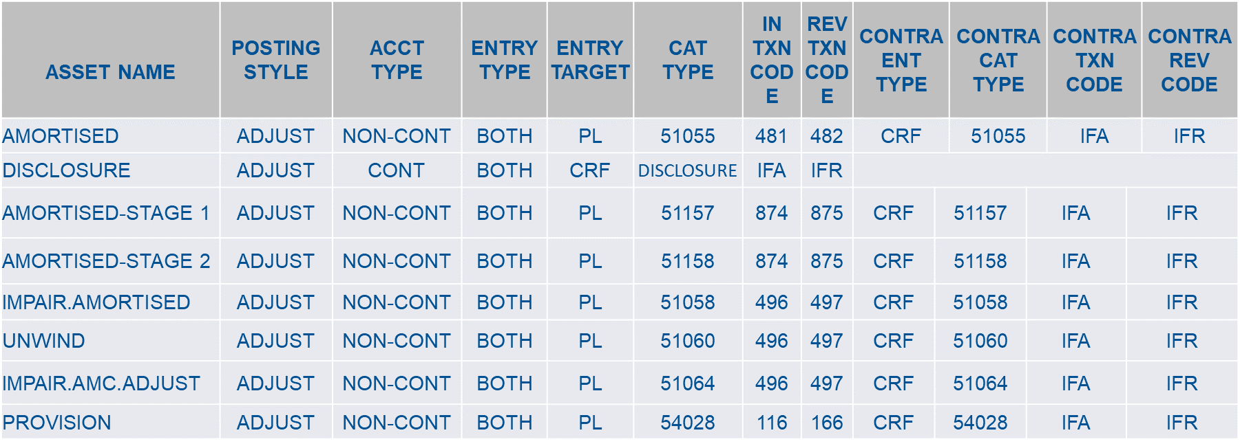 This table stores the details relating to the way the accounting entries are generated in order to make the contracts compatible with IFRS9 requirements. This displays as a separate table so that the user can configure based on their requirements.