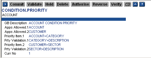 CONDITION.PRIORITY record for ACCOUNT, the Priority Item ‘ACCOUNT>CATEGORY’ can have a validation specified in the Prty Validation field as ‘CATEGORY>DESCRIPTION’. In this case, when a value for the CATEGORY is entered in ACCT.GEN.CONDITION, the value entered should be a valid record ID in the CATEGORY application, and the value of the Description field in that CATEGORY record will be displayed as an enrichment.