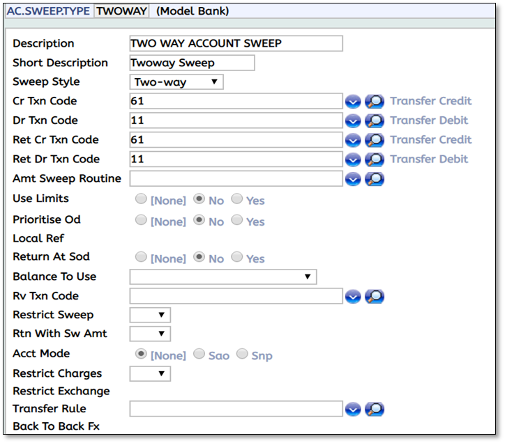 The Amt Sweep Routine field can be used to attach a local routine, which returns a locally calculated sweep amount. In the absence of a local routine, system uses the amount from the AC.ACCOUNT.LINK records to determine the amount of funds to be swept.
