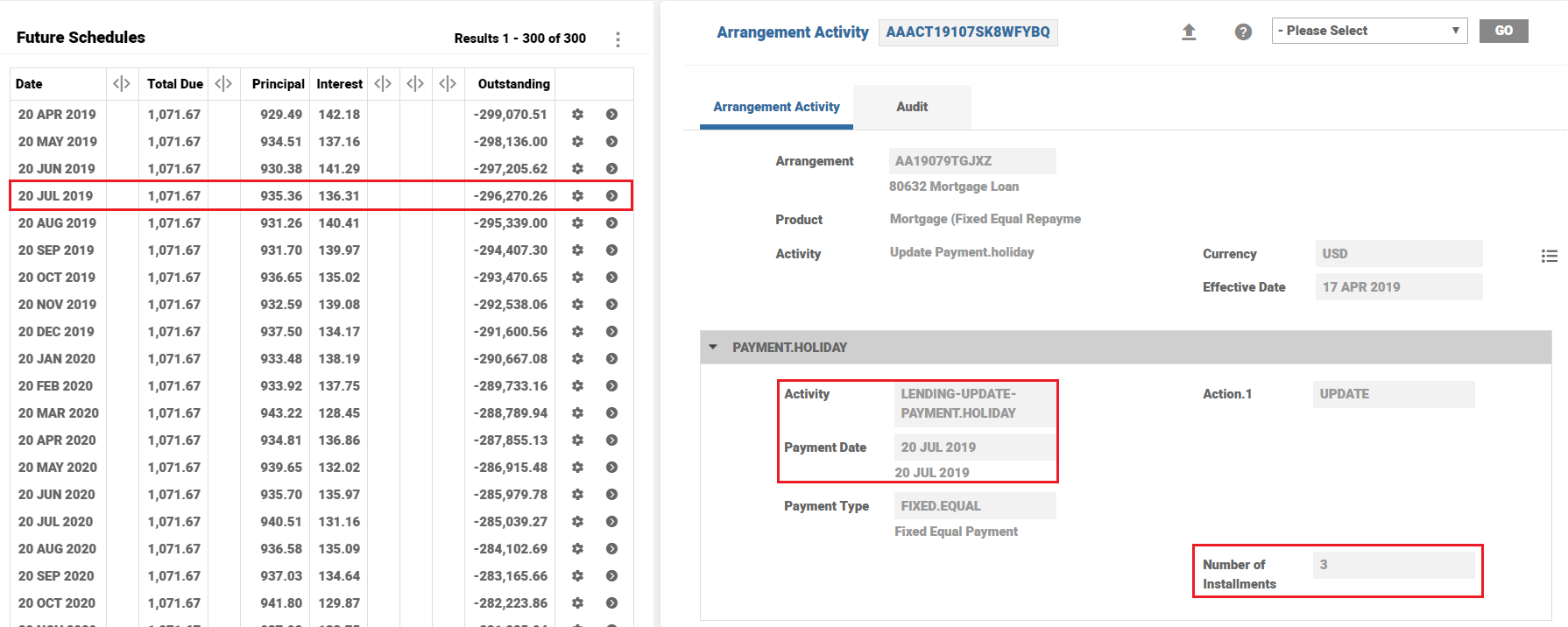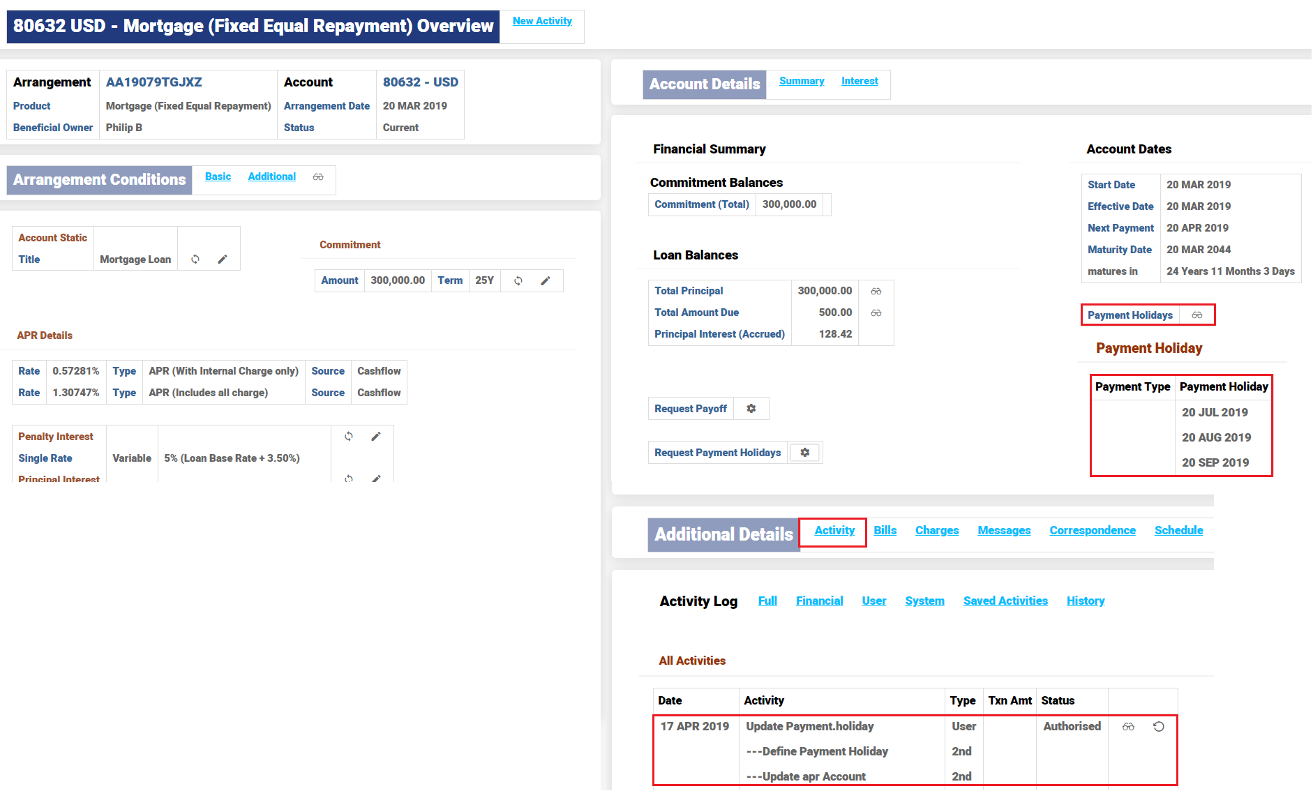 The below set of screenshots display the payment holiday applied on a Mortgage loan.