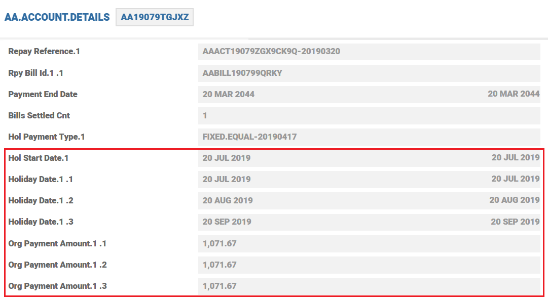 Payment holiday details as updated in AA.ACCOUNT.DETAILS is shown below.