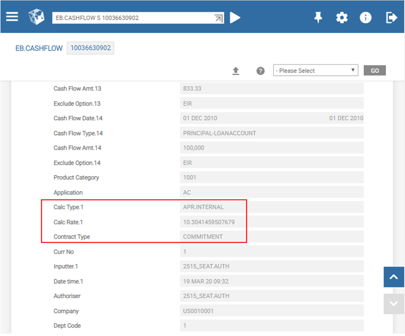 The following screenshot shows the Contract Type field (in the EB.CASHFLOW application) set as COMMITMENT and the APR calculated in the Calc Rate field.