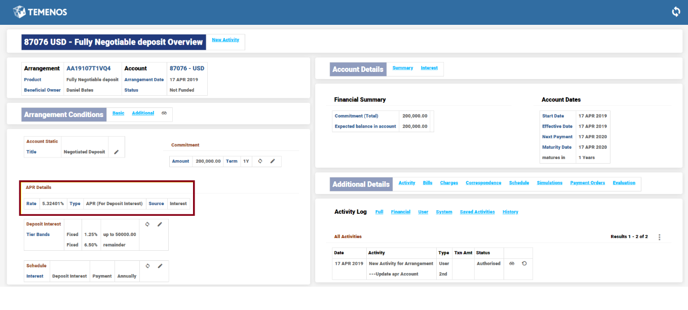 When a deposit is created for USD 200,000, the APR is calculated at 5.32% and presented in the Arrangement Overview.