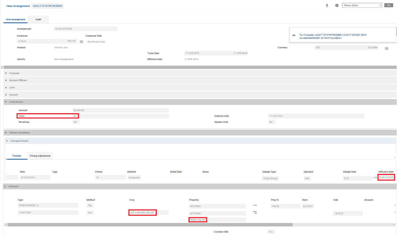 The following screenshots show the simulation of rate change activity on disbursed arrangements. APR is calculated based on the new rate in the simulating rate change activity.
