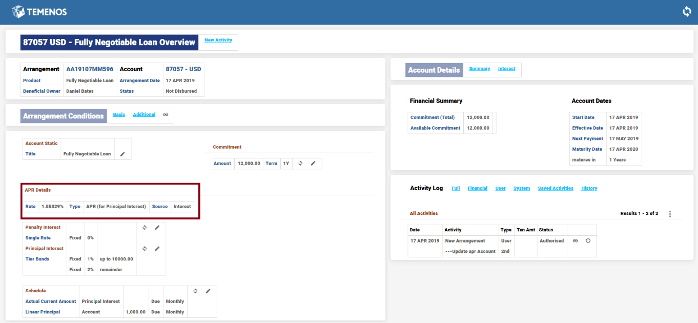 When a personal loan arrangement is opened for a customer with teaser or promotional rates for an initial period similar to the above illustration, the final APR arrived from the combined weighted average interest is calculated and displayed on the arrangement overview.