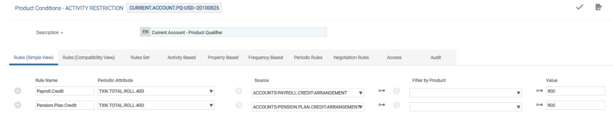 - The below example shows the product Qualifier rule defined to trigger a change Product activity (Current account to a Payroll account) when an arrangement receives an eligible (salary or pension) credit more than 900 USD. The system periodically (say every 3 days) evaluates this rule.