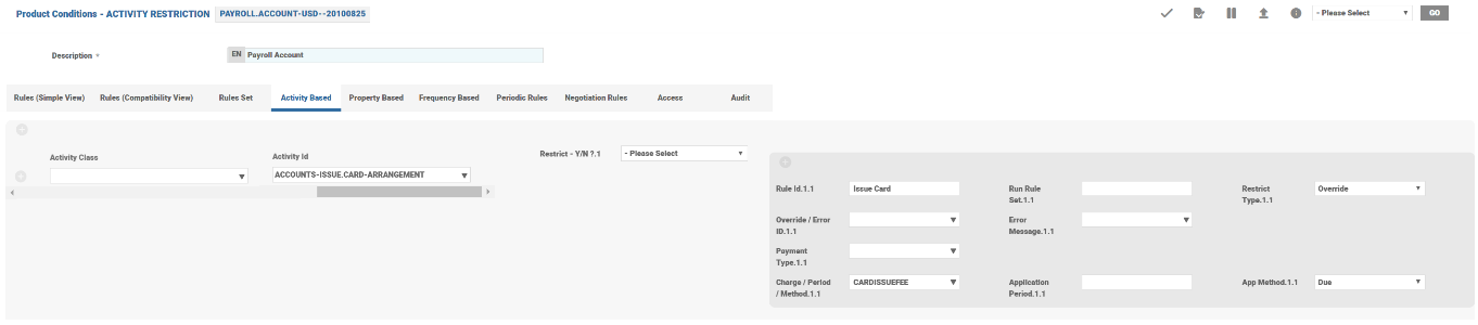 - Activity Restriction is used to apply restriction rules to transactions activities such as withdrawal, deposit, prepayment, etc. Activities in the life of the arrangement are monitored against the rules and breaking of a rule can result in the application of a penalty, override or rejection of the transaction.