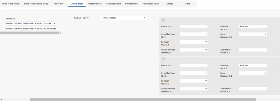 Attribute Definition Activity Class It allows the user to designate an Activity Class for rule evaluation. When multiple Activity Classes are designated, the rule is evaluated against each Activity Class. It is mutually exclusive with Activity. Activity ID It allows the user to designate an Activity for rule evaluation. It is mutually exclusive with Activity Class. Restrict (Y/N) It allows the user to designate if the Activity Class or Activity has to be restricted unconditionally. The value Yes indicates the Activity Class or Activity has to be restricted. Rule ID It allows the user to designate the rule previously defined in the Rules tab. It is mutually exclusive with the Run Rule Set attribute. Run Rule Set It allows the user to designate the rule previously defined in the Rules Set tab. It is mutually exclusive with the Run Rule attribute and is only allowed for product qualifier type of rules. Read Product Qualifier Rules for more information. Restrict Type This indicates that the result of rule evaluation can be a complete restriction or a partial restriction that is applied using error or override, respectively. Override ID If the transaction is to be allowed after displaying a warning, then the user can state an override message here which appears whenever this activity is triggered on an arrangement. Entry into this attribute is mandatory only when Restrict Type is set to ‘Override’. Error Message If the transaction is completely blocked, the user can state an error message displaying the restriction. Entry into this attribute is mandatory only when Restrict Type is set to ‘Error’. Payment Type When a rule break charge is set to capitalise and account does not have sufficient balance to capitalise the charge, the bank can choose to invoice the pending amount to the customer using the ‘Cap and Inv’ payment method. It is possible to set recycling conditions to retry capitalising these charges using RC Type and RC Condition in the Settlement Condition.
