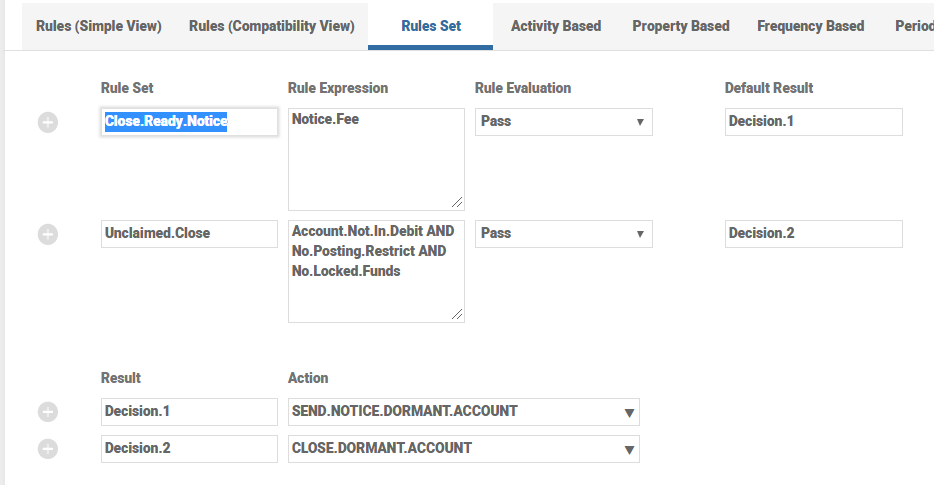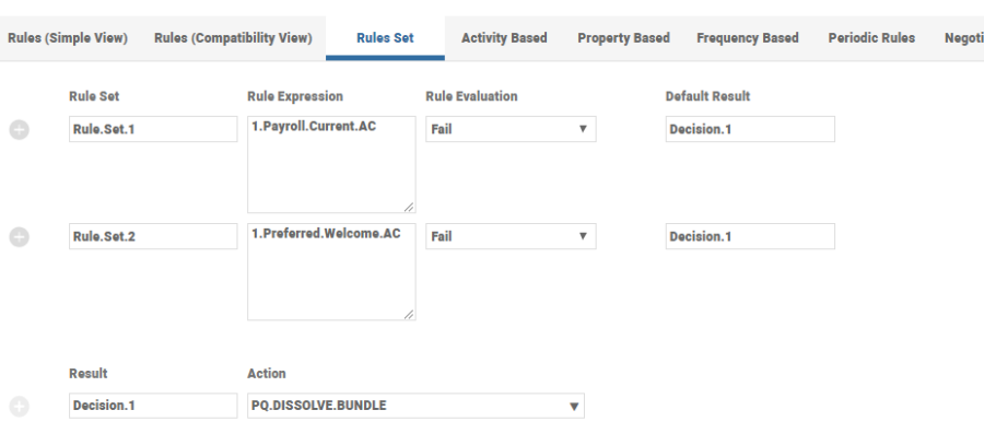 - The Rule Set tab allows the user to combine single or multiple rule(s) for evaluation. Each rule set is tied with a result which is executed by the system based on their evaluation criteria.