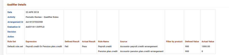NOTE: The Product Qualifier attributes are different set, independent of the Pricing set of attributes. - In the below screenshot, we have Payroll Credit or Pension Plan Credit that is expected to Pass. We have Payroll Credit Passing and Pension Plan Failing, the operand being OR the overall result is Pass, against the defined evaluation result is Fail (meaning the action is taken on Failing).