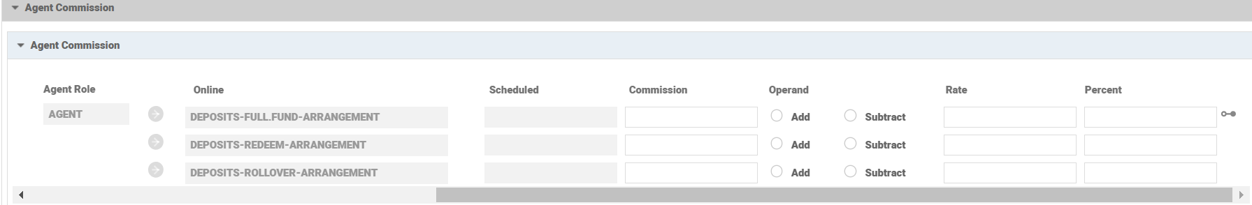 - When the financial arrangement is initially created, the system dynamically builds the Agent Commission property and populates it with the Product Commission values.