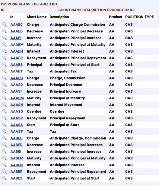 The difference between mandatory and optional position classes is the fourth character in a Position class which is always “E” for optional position class. The system has the intelligence to use either optional or mandatory position classes based on the certainty about principal funding or disbursal dates. Both the Position classes have to be defined in PM.POSN.CLASS and also included in CAS and GAP records in PM.POSN.REFERENCE, if the PM user opts to include the optional position classes also in PM projections. For example, if the mandatory position class is built with AAPMS (Start event for a loan or deposit with timing certainty) an optional position class is built with AAPES (start event with no timing certainty).