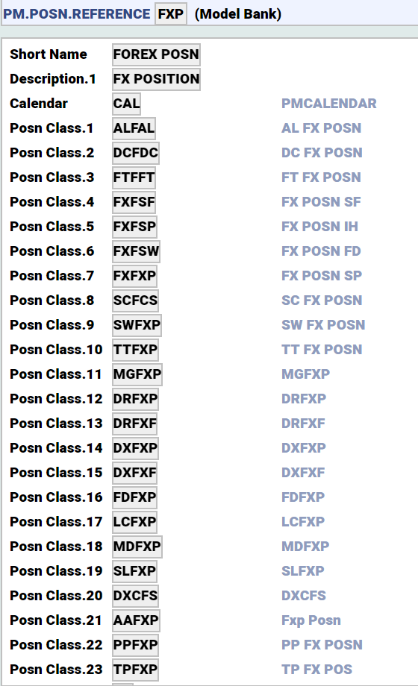POS.CLASS.FX- The Pos Class.1 Fx Pos field specifies the Position Class used to show the currency Position in FXP Position reference if the transaction gives raise to currency Position. The Currency Position so shown is real FX position and not Forward FX Position. The value must exist in the PM.POSN.CLASS table.