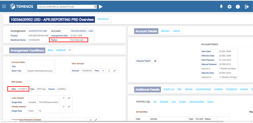 The following screenshots show the simulation of rate change activity on disbursed arrangements. APR is calculated based on the new rate in the simulating rate change activity.