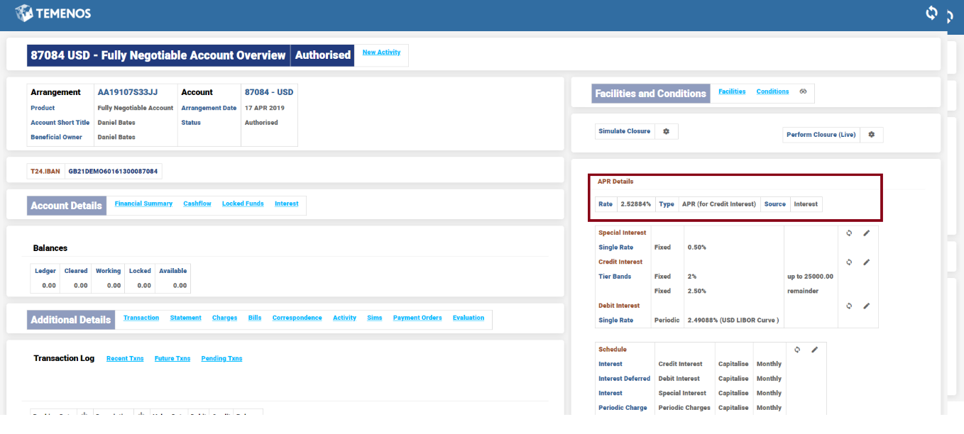 When a savings account is opened based on the above setup, the APR is arrived at 2.52 and presented in the arrangement overview.